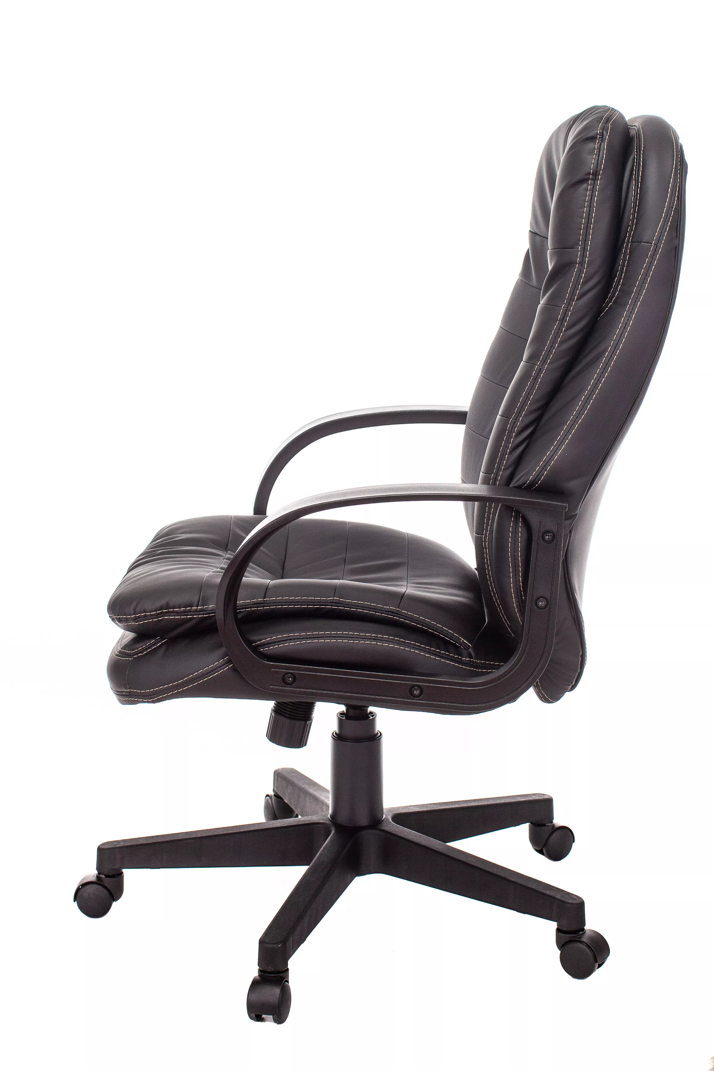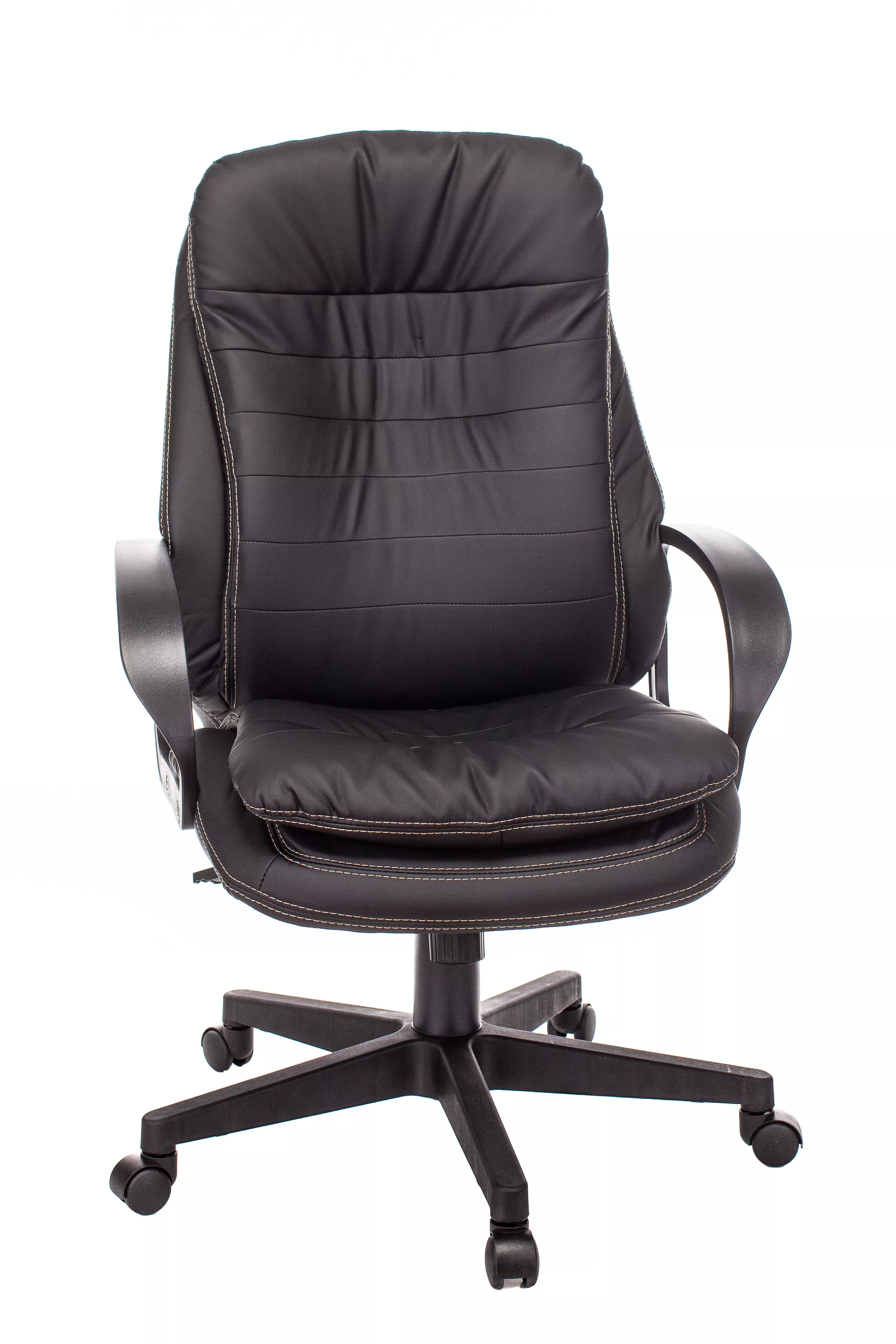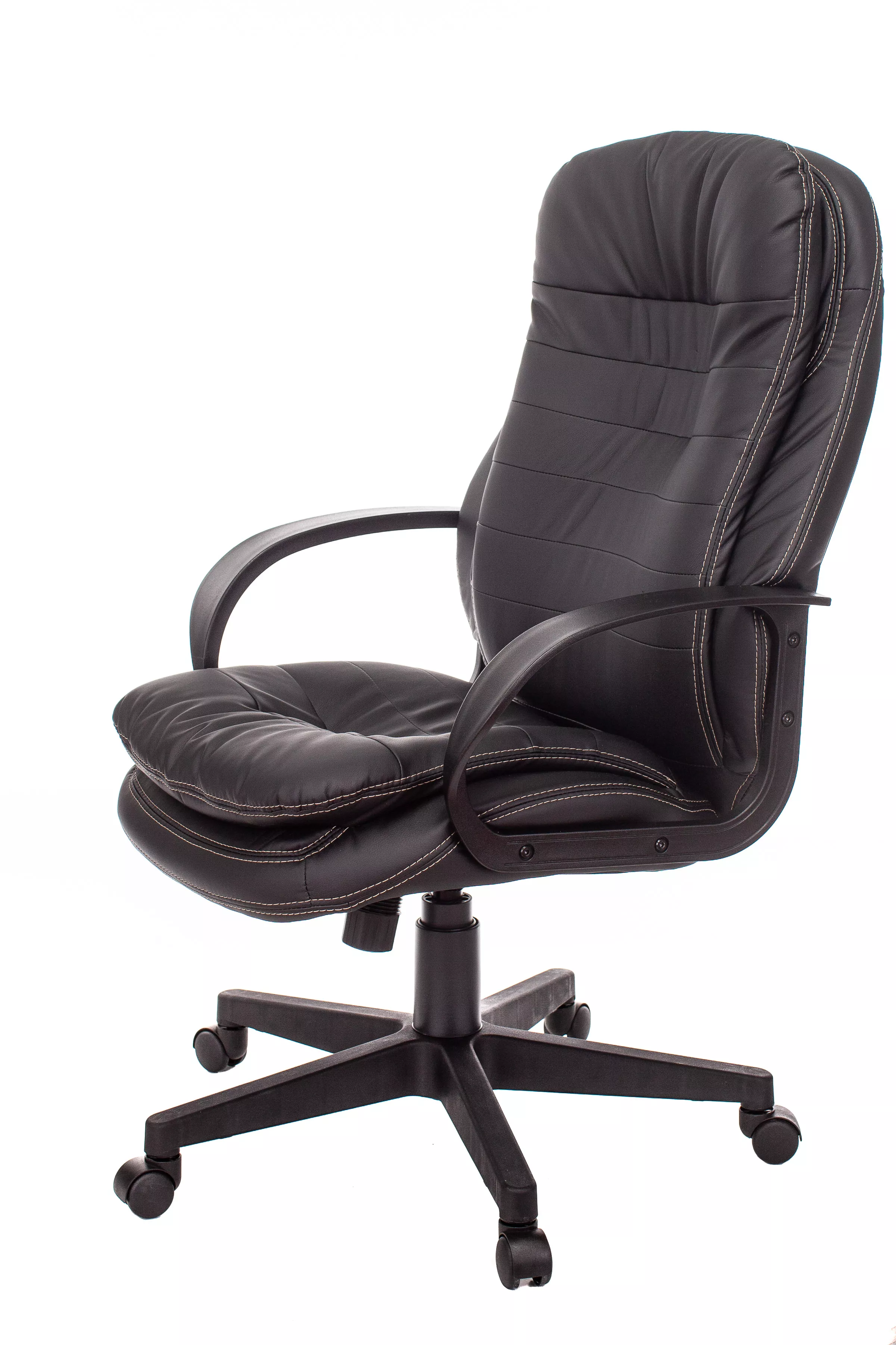 Обивка кресла выполнена из высококачественной экокожи черного цвета, которая не только стильно смотрится, но и легко чистится. Спинка кресла отделена от сиденья, что позволяет обеспечить лучшую вентиляцию и комфорт при длительном сидении. Высота кресла варьируется от 1065 мм до 765 мм с подлокотниками, а высота сиденья составляет 495 мм. Ширина сиденья — 565 мм, а глубина — 460 мм, что обеспечивает достаточное пространство для комфортного размещения.