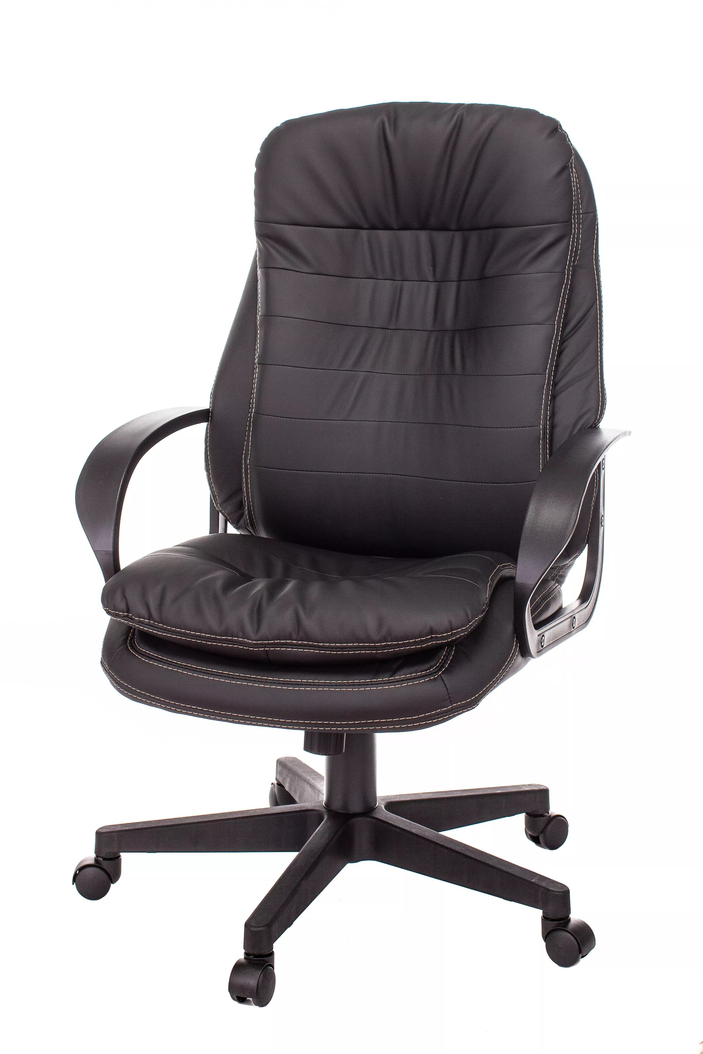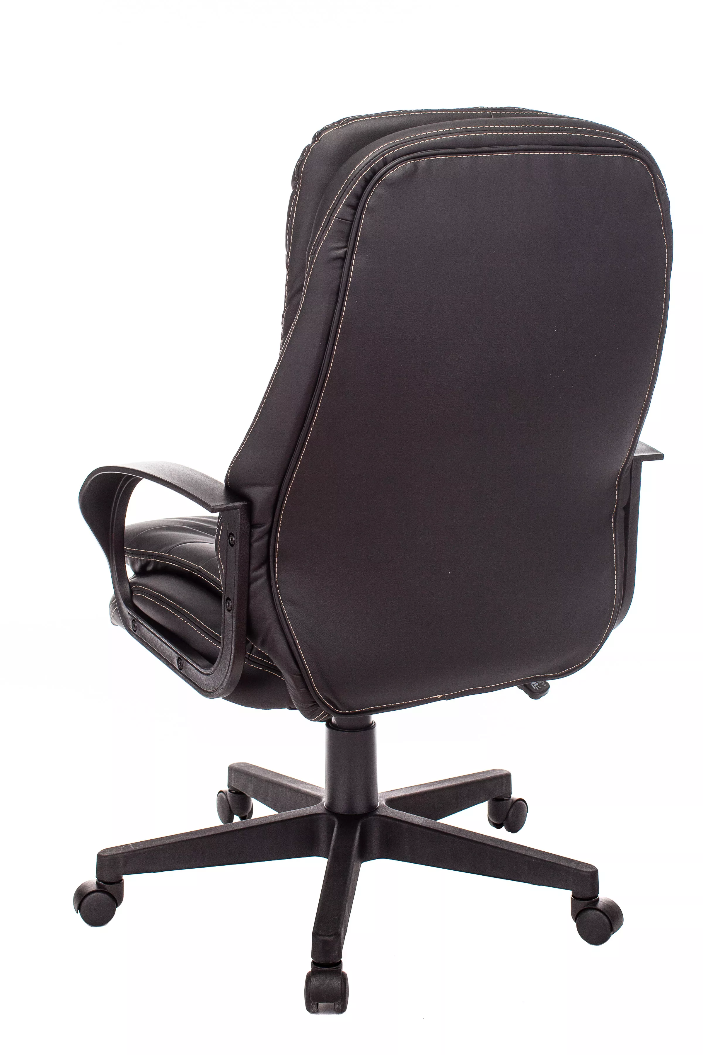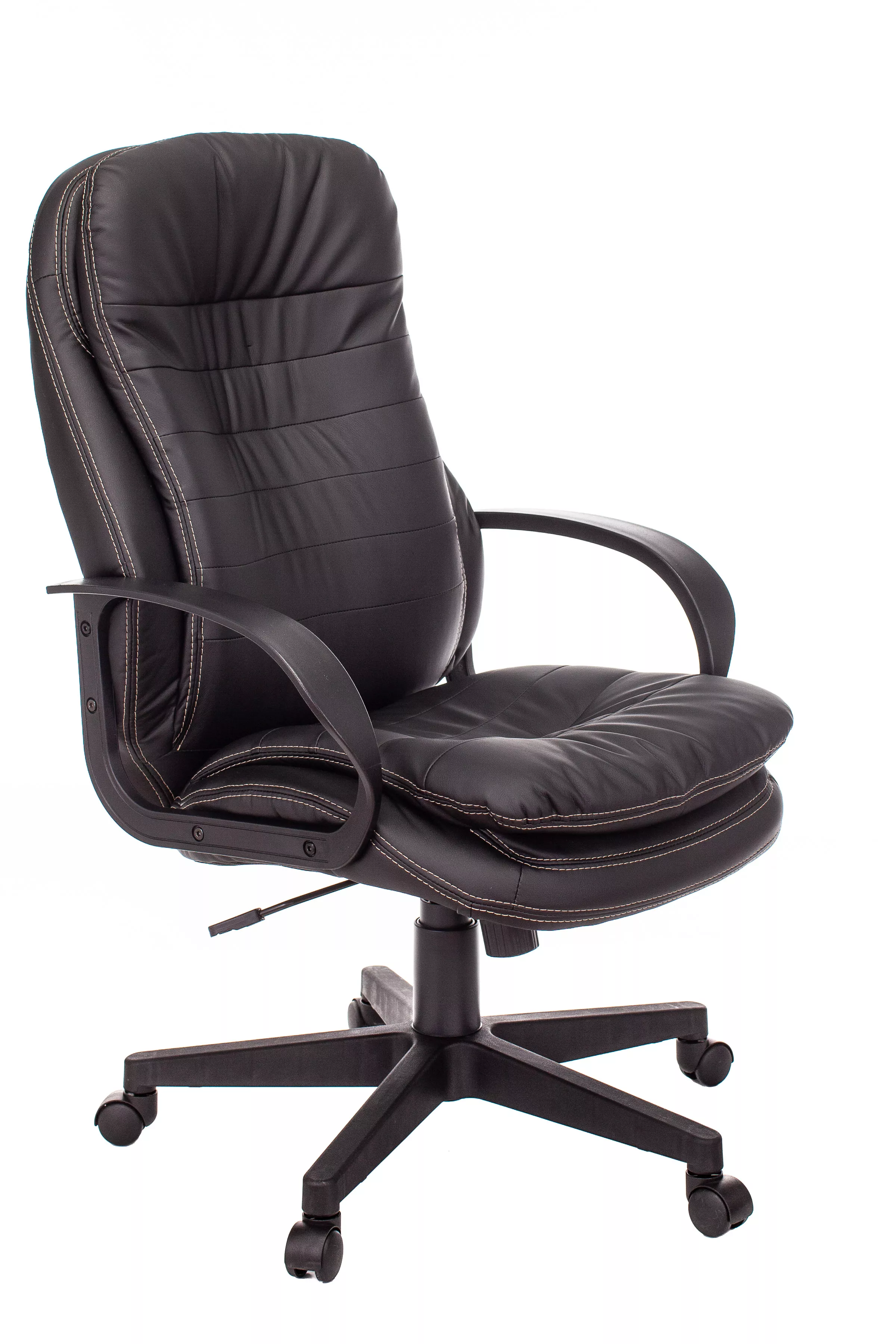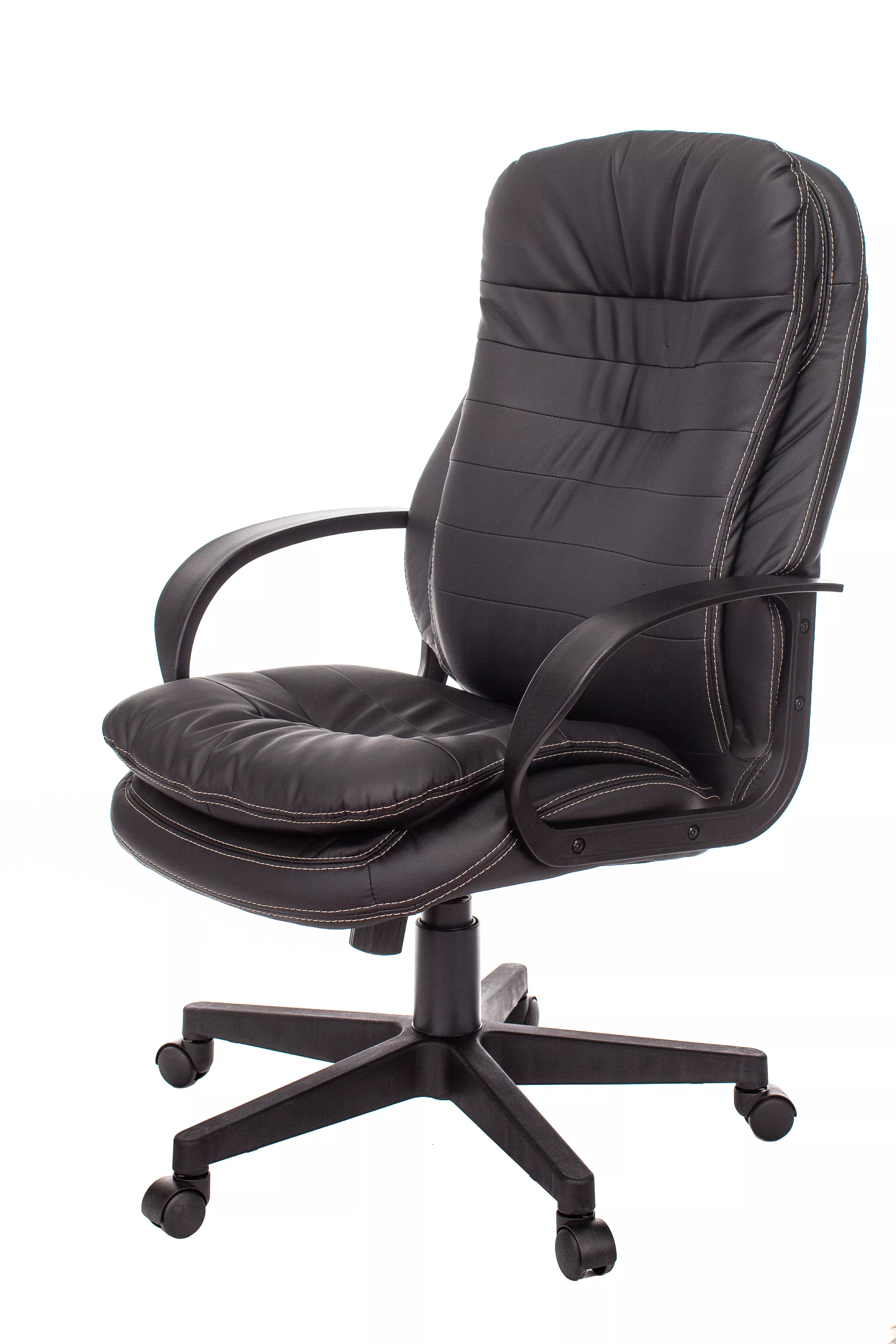 Обивка кресла выполнена из высококачественной экокожи черного цвета, которая не только стильно смотрится, но и легко чистится. Спинка кресла отделена от сиденья, что позволяет обеспечить лучшую вентиляцию и комфорт при длительном сидении. Высота кресла варьируется от 1065 мм до 765 мм с подлокотниками, а высота сиденья составляет 495 мм. Ширина сиденья — 565 мм, а глубина — 460 мм, что обеспечивает достаточное пространство для комфортного размещения.
